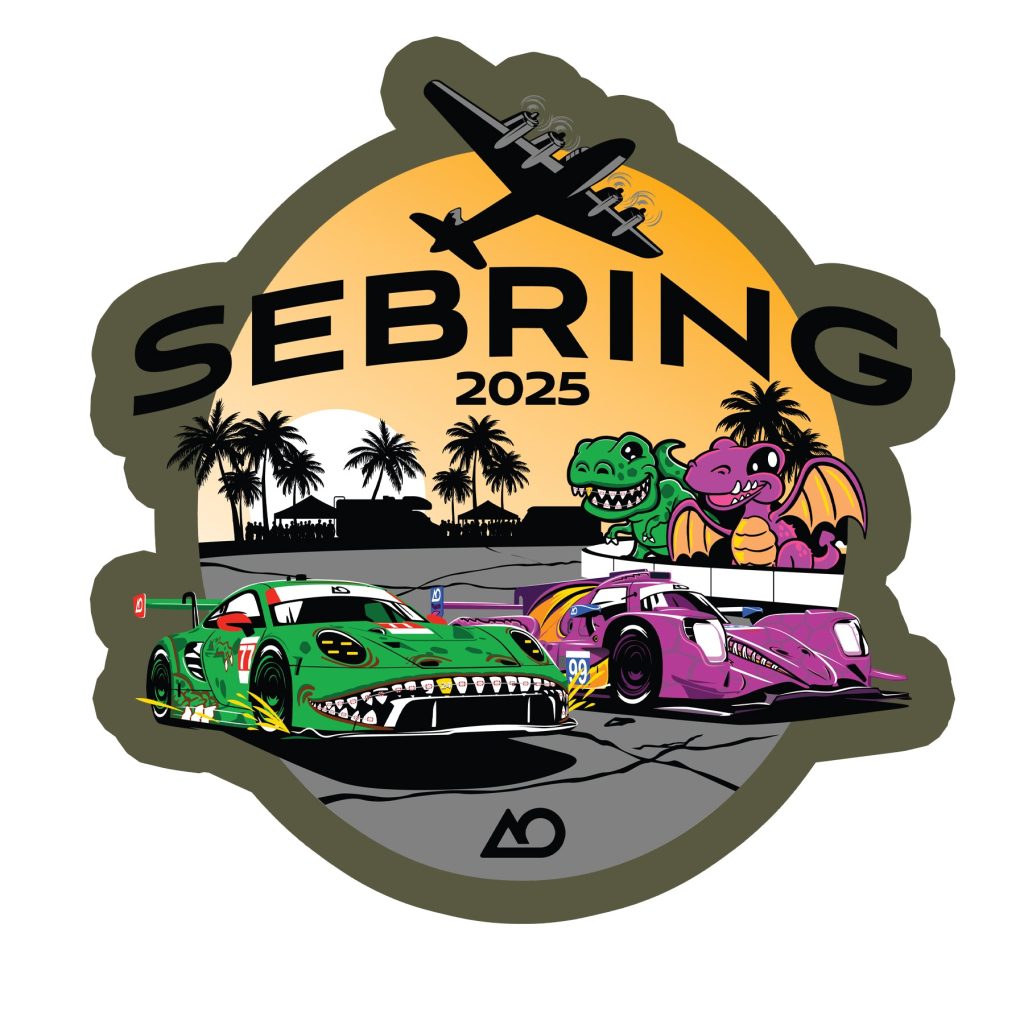 Cracked pavement, roaring engines, and prehistoric power: this is Sebring, AO-style. Celebrate one of the wildest races on the IMSA calendar with this vibrant sticker featuring both of AO Racing’s beasts: Rexy the green GTD dino, and Spike the fierce purple dragon LMP2. With the Florida sunset, palm trees, and a B-17 flyover silhouette setting […]
